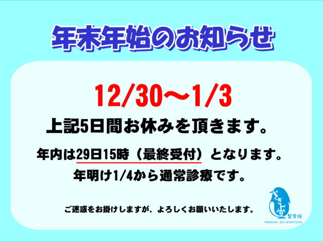 12/30~1/3まで休診させて頂きます。 年内最終日は12 …